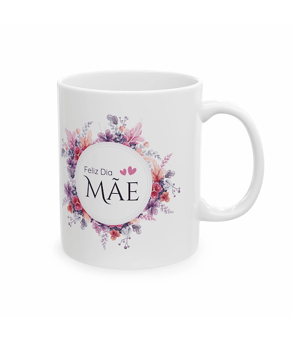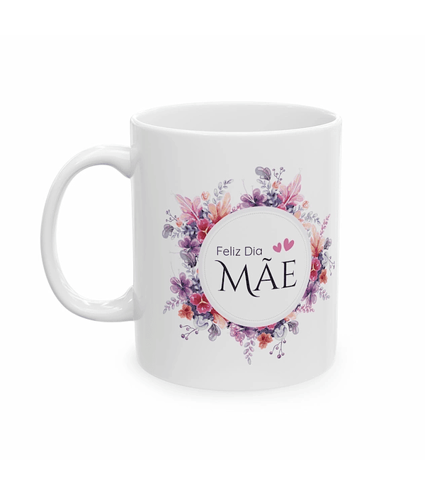 Deixa a tua mãe sentir todo o teu amor com esta caneca decorada com a mensagem "Feliz Dia Mãe" cercada por delicadas flores.