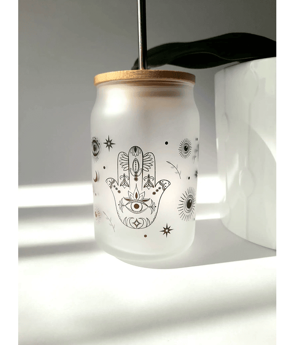 Copo de vidro fosco personalizado com um toque de misticismo, estilo "glass can", ideal para todas as bebidas, desde um café gelado refrescante até um cocktail elegante. Mais do que um copo, é um amuleto de positividade que irá transformar o teu dia-a-dia.